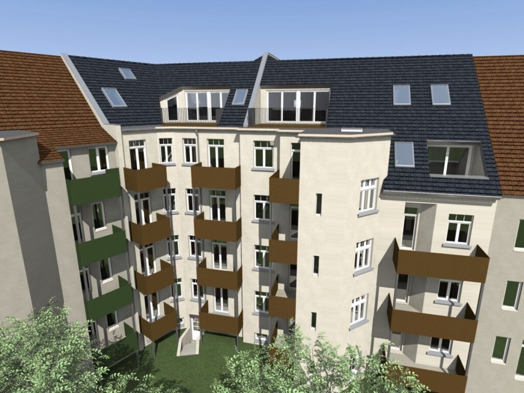 Das denkmalgeschützte Jugendstilhaus wurde liebevoll saniert und erstrahlt im neuen Glanz. Im Zuge der Baumaßnahmen entstanden 8 hochwertig ausgestattete Wohneinheiten mit nachfragegerechten Grundrissen. Die Balkone der Wohnungen (Südwest) richten sich optimal in den grünen Innenhof, welcher im Zuge der Sanierung neu gärtnerisch gestaltet wird.